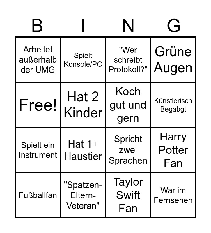 This bingo card has 16 words: "Spatzen-Eltern-Veteran", Harry Potter Fan, "Wer schreibt Protokoll?", Arbeitet außerhalb der UMG, Spielt ein Instrument, Spielt Konsole/PC, Spricht zwei Sprachen, Taylor Swift Fan, Free!, Hat 2 Kinder, Fußballfan, Grüne Augen, Hat 1+ Haustier, Künstlerisch Begabgt, Koch gut und gern and War im Fernsehen.