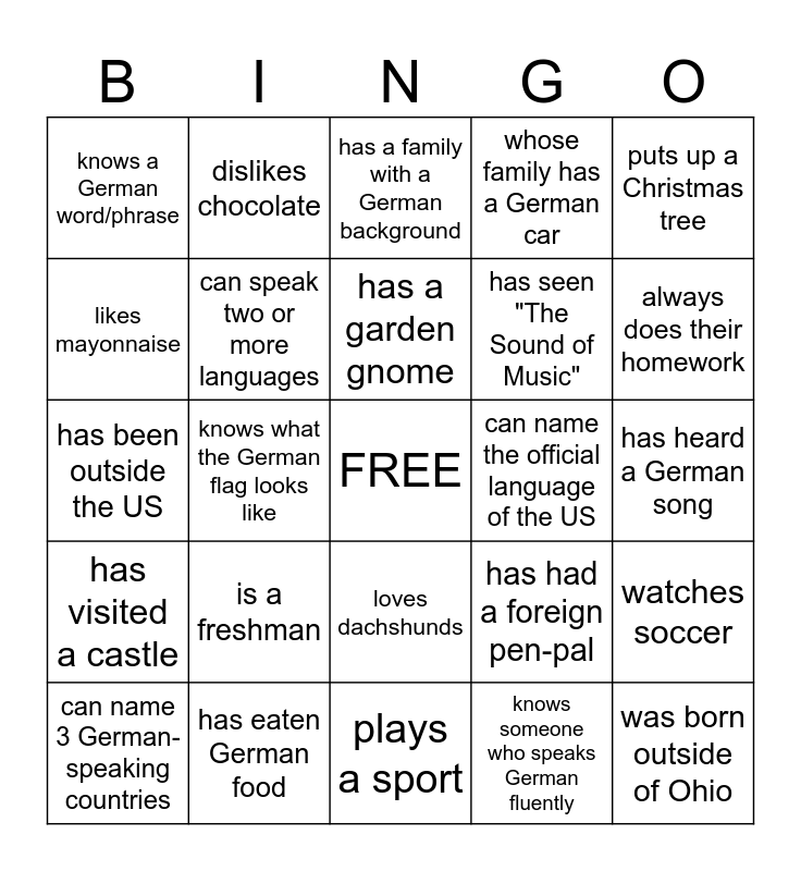 This bingo card has a free space and 29 words: can name 3 German-speaking countries, has been to Europe, knows what the German flag looks like, can speak a Germanic language, knows a German word/phrase, has a family with a German background, can speak two or more languages, is a freshman, can name the official language of the US, has eaten German food, has heard a German song, was born outside of Ohio, plays a sport, knows someone who speaks German fluently, always does their homework, is in German 4, loves dachshunds, has visited a castle, puts up a Christmas tree, has been outside the US, has had a foreign pen-pal, says Gesundheit when people sneeze, has seen "The Sound of Music", likes mayonnaise, whose family has a German car, dislikes chocolate, watches soccer, has a garden gnome and has worn socks with sandals.