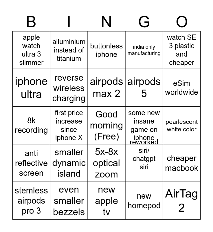 This bingo card has a free space and 24 words: smaller dynamic island, even smaller bezzels, airpods max 2, stemless airpods pro 3, watch SE 3 plastic and cheaper, apple watch ultra 3 slimmer, iphone ultra, alluminium instead of titanium, some new insane game on iphone, 5x-8x optical zoom, airpods 5, 8k recording, reworked siri/ chatgpt siri, cheaper macbook, reverse wireless charging, new homepod, pearlescent white color, buttonless iphone, eSim worldwide, first price increase since iphone X, AirTag 2, anti reflective screen, india only manufacturing and new apple tv.