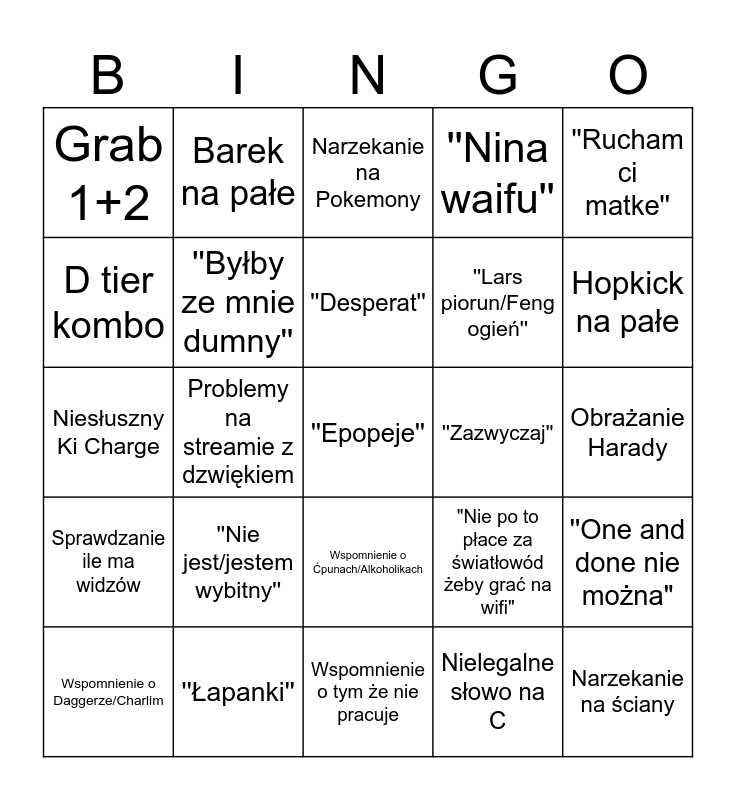 This bingo card has a free space and 24 words: ''Nie jest/jestem wybitny'', ''Łapanki'', ''Desperat'', Wspomnienie o Daggerze/Charlim, ''Rucham ci matke'', Grab 1+2, D tier kombo, Barek na pałe, ''Zazwyczaj'', Wspomnienie o Ćpunach/Alkoholikach, ''Lars piorun/Feng ogień'', Niesłuszny Ki Charge, "Nie po to płace za światłowód żeby grać na wifi", ''One and done nie można", ''Byłby ze mnie dumny'', Nielegalne słowo na C, Obrażanie Harady, Narzekanie na Pokemony, Hopkick na pałe, Problemy na streamie z dzwiękiem, Narzekanie na ściany, Sprawdzanie ile ma widzów, ''Nina waifu'' and Wspomnienie o tym że nie pracuje.