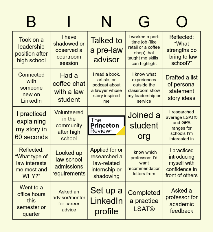 This bingo card has a free space and 29 words: Went to a office hours this semester or quarter, Created or updated a resume, Volunteered in the community after high school, Had a coffee chat with a lawyer, Took on a leadership position after high school, Talked to a pre-law advisor, Had a coffee chat with a law student, Looked up law school admissions requirements, Joined a student org, Asked an advisor/mentor for career advice, I researched average LSAT® and GPA ranges for schools I’m interested in, Asked a professor for academic feedback, Set up a LinkedIn profile, Completed a practice LSAT®, Drafted a list of personal statement story ideas, Reflected: “Do I know WHY I want to go to law school?”, Applied for or researched a law-related internship or shadowing, Reflected: “What type of law interests me most and WHY?”, Reflected: “What strengths do I bring to law school?”, I practiced explaining my story in 60 seconds, I know which professors I’d want recommendation letters from, I reflected on why law school is the right next step for me, I know what experiences outside the classroom show my leadership or service, Connected with someone new on LinkedIn, I worked a part-time job (like retail or a coffee shop) that taught me skills I can highlight, I have shadowed or observed a courtroom session, I practiced introducing myself with confidence in front of others, I read a book, article, or podcast about a lawyer whose story inspired me and I've read a book outside of class just for fun.