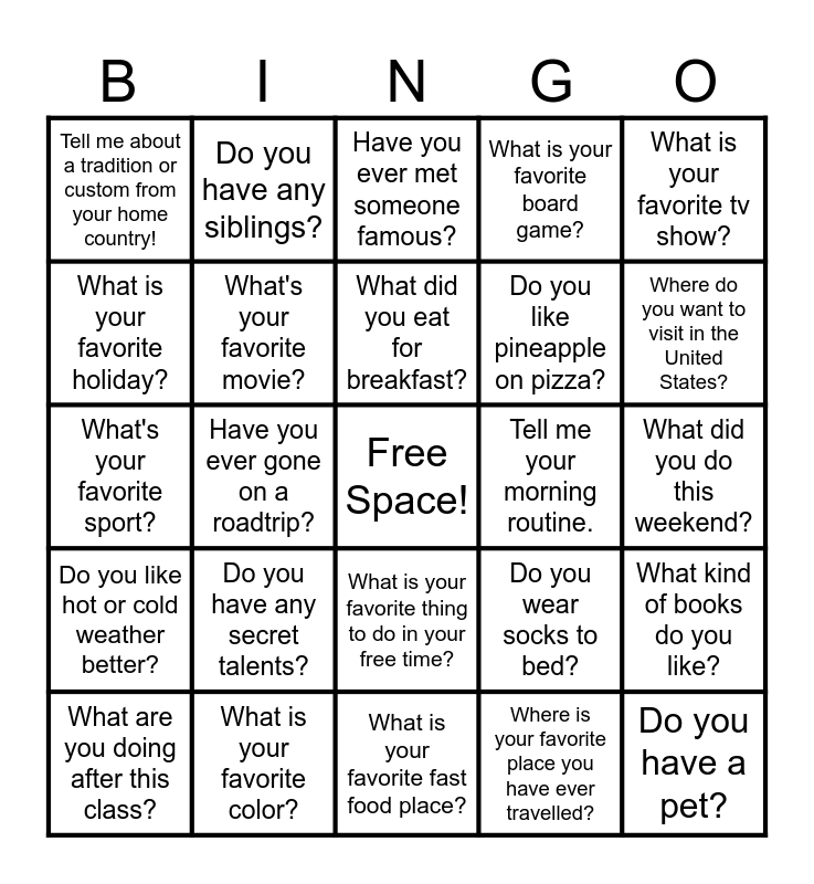 This bingo card has a free space and 24 words: Do you have any secret talents?, What is your favorite color?, What did you eat for breakfast?, What are you doing after this class?, What is your favorite tv show?, Tell me about a tradition or custom from your home country!, What is your favorite holiday?, Do you have any siblings?, Tell me your morning routine., What is your favorite thing to do in your free time?, Do you like pineapple on pizza?, What's your favorite sport?, Do you wear socks to bed?, What kind of books do you like?, What's your favorite movie?, Where is your favorite place you have ever travelled?, What did you do this weekend?, Have you ever met someone famous?, Where do you want to visit in the United States?, Have you ever gone on a roadtrip?, Do you have a pet?, Do you like hot or cold weather better?, What is your favorite board game? and What is your favorite fast food place?.