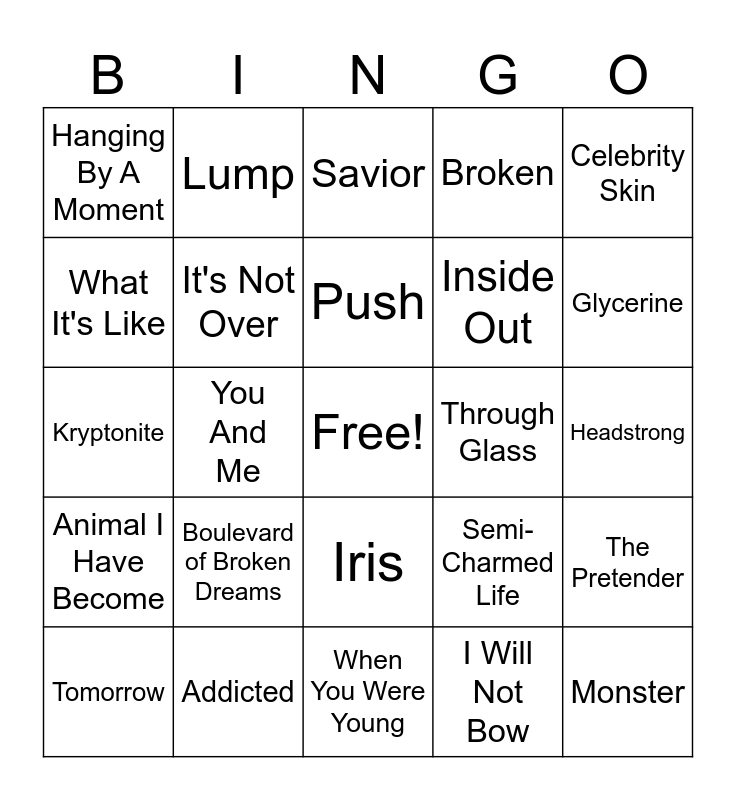 This bingo card has a free space and 41 words: How You Remind Me, Kryptonite, Buddy Holly, It's Not Over, Addicted, Iris, Push, Drive, Celebrity Skin, Animal I Have Become, You And Me, Broken, Monster, Headstrong, Through Glass, Boulevard of Broken Dreams, One Last Breath, Hanging By A Moment, With Arms Wide Open, Savior, The Pretender, Everlong, When You Were Young, Inside Out, Can't Stop, My Immortal, I Will Not Bow, When I'm Gone, Glycerine, No Rain, Wonderwall, Lump, Tomorrow, Closing Time, Semi-Charmed Life, What It's Like, All For You, Plush, Father of Mine, Today and In Bloom.