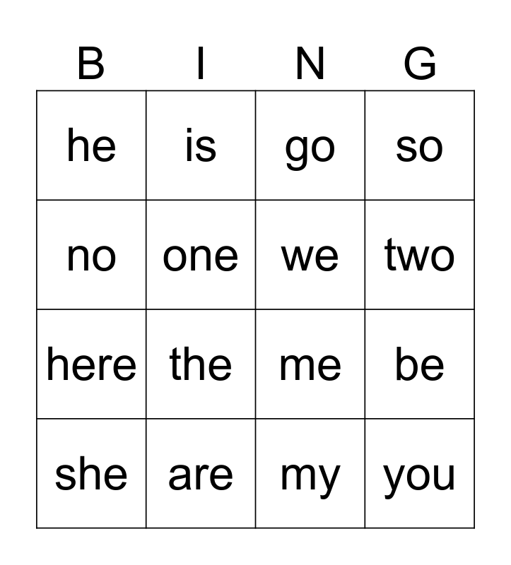 This bingo card has 16 words: are, be, go, he, here, is, me, my, no, one, she, so, the, two, we and you.