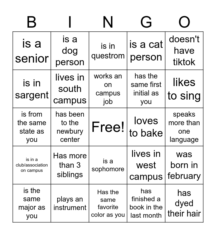 This bingo card has a free space and 24 words: Has more than 3 siblings, plays an instrument, works an on campus job, is the same major as you, doesn't have tiktok, is a senior, is in sargent, is a dog person, loves to bake, is a sophomore, has the same first initial as you, is from the same state as you, lives in west campus, was born in february, lives in south campus, has finished a book in the last month, speaks more than one language, is in questrom, likes to sing, has been to the newbury center, has dyed their hair, is in a club/association on campus, is a cat person and Has the same favorite color as you.