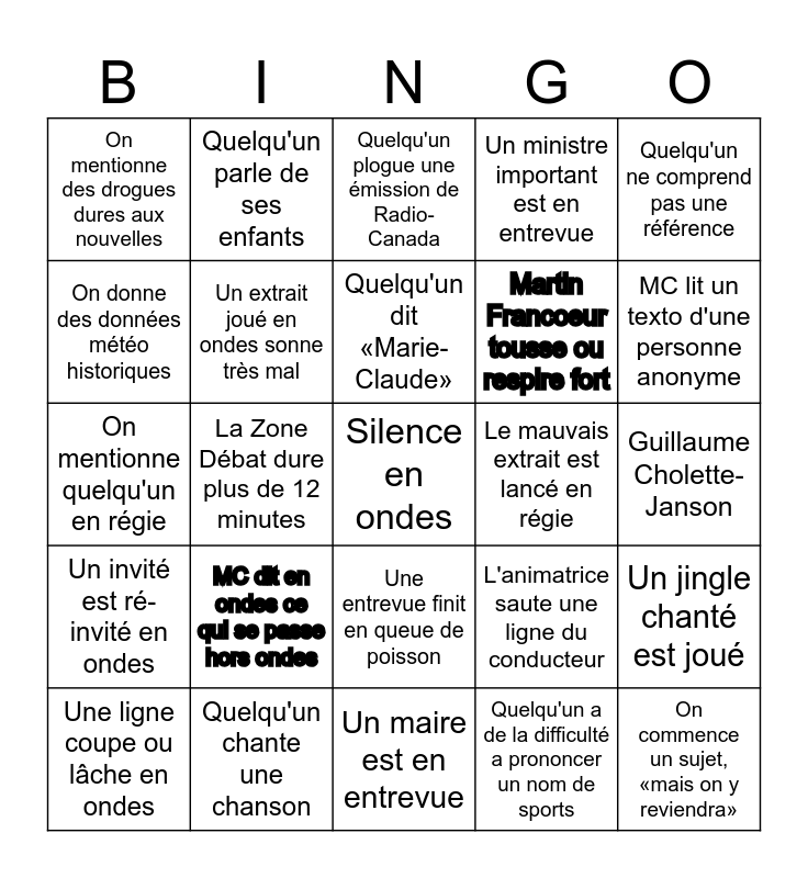 This bingo card has a free space and 24 words: MC dit en ondes ce qui se passe hors ondes, Quelqu'un chante une chanson, Quelqu'un dit «Marie-Claude», Une ligne coupe ou lâche en ondes, Quelqu'un ne comprend pas une référence, On mentionne des drogues dures aux nouvelles, On donne des données météo historiques, Quelqu'un parle de ses enfants, Le mauvais extrait est lancé en régie, Une entrevue finit en queue de poisson, Martin Francoeur tousse ou respire fort, On mentionne quelqu'un en régie, L'animatrice saute une ligne du conducteur, Un jingle chanté est joué, Un extrait joué en ondes sonne très mal, Quelqu'un a de la difficulté a prononcer un nom de sports, Guillaume Cholette-Janson, Quelqu'un plogue une émission de Radio-Canada, MC lit un texto d'une personne anonyme, La Zone Débat dure plus de 12 minutes, On commence un sujet, «mais on y reviendra», Un invité est ré-invité en ondes, Un ministre important est en entrevue and Un maire est en entrevue.
