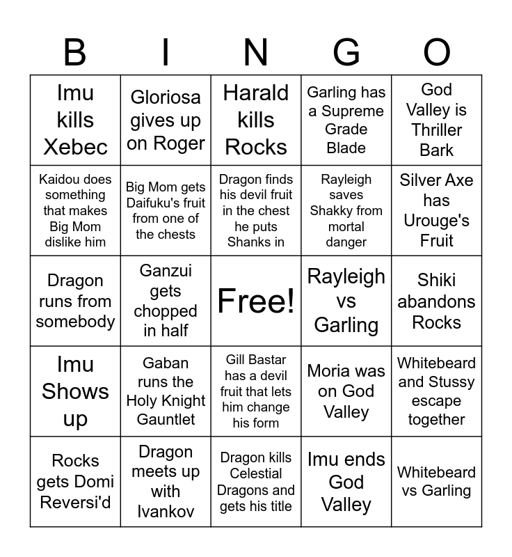 This bingo card has a free space and 24 words: Gaban runs the Holy Knight Gauntlet, Dragon meets up with Ivankov, Dragon finds his devil fruit in the chest he puts Shanks in, Rocks gets Domi Reversi'd, God Valley is Thriller Bark, Imu kills Xebec, Kaidou does something that makes Big Mom dislike him, Gloriosa gives up on Roger, Rayleigh vs Garling, Gill Bastar has a devil fruit that lets him change his form, Rayleigh saves Shakky from mortal danger, Dragon runs from somebody, Moria was on God Valley, Whitebeard and Stussy escape together, Big Mom gets Daifuku's fruit from one of the chests, Imu ends God Valley, Shiki abandons Rocks, Harald kills Rocks, Silver Axe has Urouge's Fruit, Ganzui gets chopped in half, Whitebeard vs Garling, Imu Shows up, Garling has a Supreme Grade Blade and Dragon kills Celestial Dragons and gets his title.