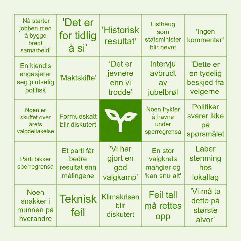 This bingo card has a free space and 24 words: Et parti får bedre resultat enn målingene, Teknisk feil, ‘Det er jevnere enn vi trodde’, Noen snakker i munnen på hverandre, 'Ingen kommentar’, ‘Nå starter jobben med å bygge bredt samarbeid’, En kjendis engasjerer seg plutselig politisk, 'Det er for tidlig å si’, Noen frykter å havne under sperregrensa, 'Vi har gjort en god valgkamp’, Intervju avbrudt av jubelbrøl, Noen er skuffet over årets valgdeltakelse, En stor valgkrets mangler og ‘kan snu alt’, Laber stemning hos lokallag, 'Maktskifte’, Feil tall må rettes opp, Politiker svarer ikke på spørsmålet, 'Historisk resultat’, 'Dette er en tydelig beskjed fra velgerne’, Formueskatt blir diskutert, ‘Vi må ta dette på største alvor’, Parti bikker sperregrensa, Listhaug som statsminister blir nevnt and Klimakrisen blir diskutert.