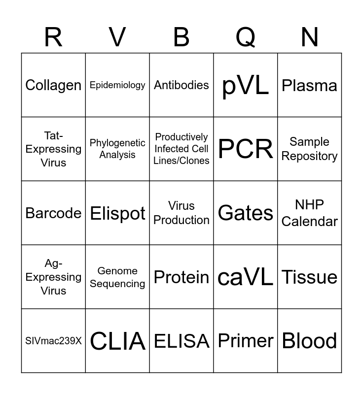 This bingo card has 36 words: SIVmac239M, KSHV, ELISA, PCR, Tissue, SIVmac239X, Elispot, Protein, pVL, Drug Preparation, Barcode, Epidemiology, Virus Production, caVL, NHP Calendar, Collagen, Uganda, Antibodies, Gates, Plasma, Ag-Expressing Virus, CLIA, Productively Infected Cell Lines/Clones, CCR5, Blood, Tat-Expressing Virus, Genome Sequencing, Undetectable, Sample Repository, Phylogenetic Analysis, Threshold, Single Cell Suspension, Transcriptomics, Primer, Probe and Thermocycler.