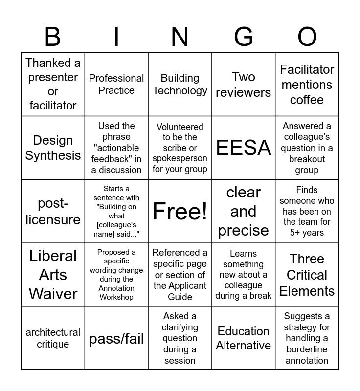 This bingo card has a free space and 28 words: Three Critical Elements, Applicant's Explanation, EESA, Education Alternative, Design Synthesis, Building Technology, Professional Practice, Liberal Arts Waiver, clear and precise, architectural critique, post-licensure, Two reviewers, pass/fail, Asked a clarifying question during a session, Answered a colleague's question in a breakout group, Shared a relevant experience from a past review, Proposed a specific wording change during the Annotation Workshop, Used the phrase "actionable feedback" in a discussion, Volunteered to be the scribe or spokesperson for your group, Referenced a specific page or section of the Applicant Guide, Thanked a presenter or facilitator, Answers a question another team member asked, Suggests a strategy for handling a borderline annotation, Starts a sentence with "Building on what [colleague's name] said...", Finds someone who has been on the team for 5+ years, Learns something new about a colleague during a break, Facilitator mentions coffee and Answers a question another team member asked.