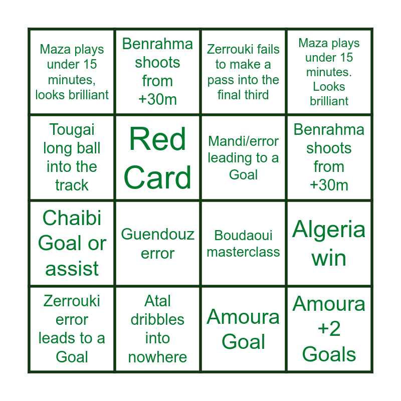 This bingo card has 20 words: Algeria win, Mahrez does not make a sprint, Zerrouki fails to make a pass into the final third, Amoura saves the day, Zerrouki error leads to a Goal, Tougai long ball into the track, Atal dribbles into nowhere, Maza plays under 15 minutes, looks brilliant, Chaibi Goal or assist, Benrahma shoots from +30m, Guendouz error, Boudaoui masterclass, Red Card, Amoura +2 Goals, Mandi/error leading to a Goal, Algeria loss, Benrahma shoots from +30m, Maza plays under 15 minutes. Looks brilliant, Amoura Goal and Amoura saves the day.