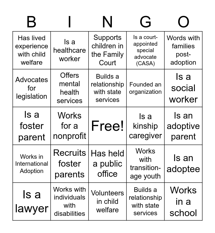 This bingo card has a free space and 24 words: Recruits foster parents, Works with individuals with disabilities, Builds a relationship with state services, Is a lawyer, Words with families post-adoption, Has lived experience with child welfare, Advocates for legislation, Is a healthcare worker, Is a kinship caregiver, Has held a public office, Founded an organization, Is a foster parent, Works with transition-age youth, Is an adoptee, Offers mental health services, Builds a relationship with state services, Is an adoptive parent, Supports children in the Family Court, Is a social worker, Works for a nonprofit, Works in a school, Works in International Adoption, Is a court-appointed special advocate (CASA) and Volunteers in child welfare.
