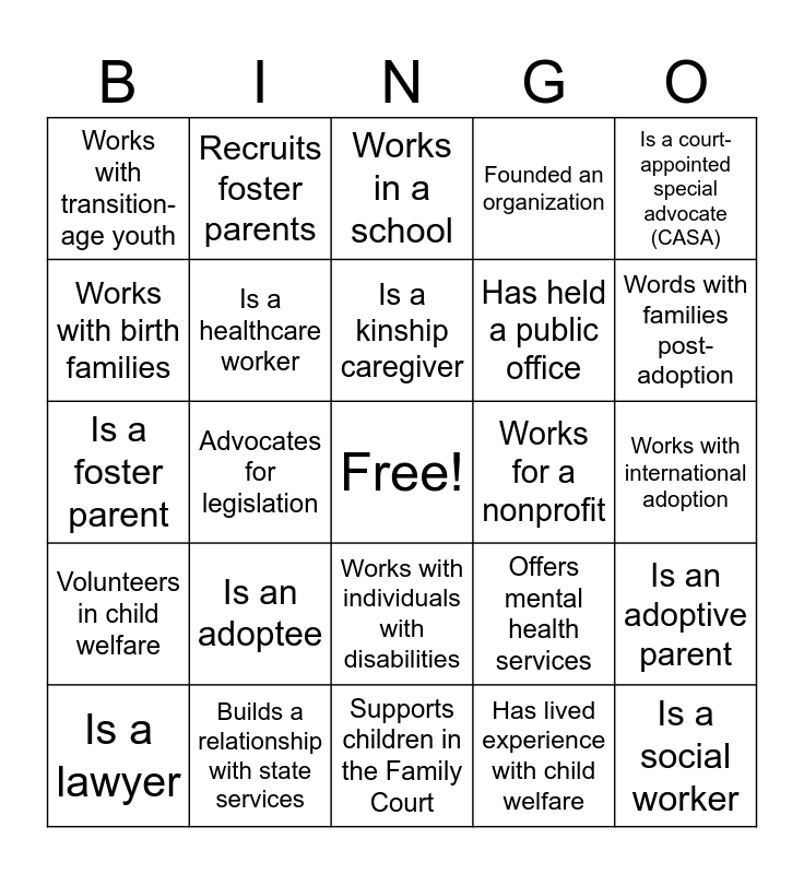 This bingo card has a free space and 24 words: Is an adoptee, Builds a relationship with state services, Is a kinship caregiver, Is a lawyer, Is a court-appointed special advocate (CASA), Works with transition-age youth, Works with birth families, Recruits foster parents, Works for a nonprofit, Works with individuals with disabilities, Has held a public office, Is a foster parent, Offers mental health services, Is an adoptive parent, Is a healthcare worker, Has lived experience with child welfare, Works with international adoption, Works in a school, Words with families post-adoption, Advocates for legislation, Is a social worker, Volunteers in child welfare, Founded an organization and Supports children in the Family Court.