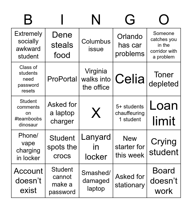 This bingo card has a free space and 29 words: Account doesn’t exist, MFA, Asked for a laptop charger, Asked for a phone charger, Extremely socially awkward student, Columbus issue, ProPortal, Student spots the crocs, 5+ students chauffeuring 1 student, Student cannot make a password, Loan limit, Board doesn’t work, Smashed/ damaged laptop, Asked for stationary, Toner depleted, Engineering software problems, Lanyard in locker, Phone/ vape charging in locker, Someone catches you in the corridor with a problem, Student comments on #teamboobs dinosaur, New starter for this week, Staff asks for win11 upgrade, Celia, Class of students need password resets, Orlando has car problems, Dene steals food, Crying student, Virginia walks into the office and Michael to say slag.