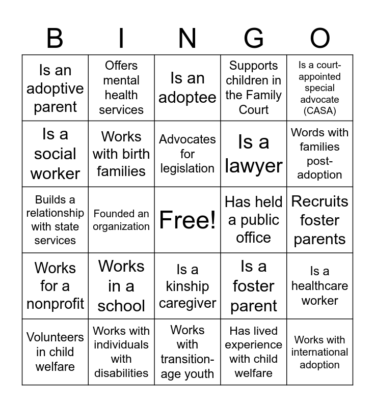 This bingo card has a free space and 24 words: Works in a school, Works with individuals with disabilities, Advocates for legislation, Volunteers in child welfare, Is a court-appointed special advocate (CASA), Is an adoptive parent, Is a social worker, Offers mental health services, Has held a public office, Is a kinship caregiver, Is a lawyer, Builds a relationship with state services, Is a foster parent, Is a healthcare worker, Works with birth families, Has lived experience with child welfare, Recruits foster parents, Is an adoptee, Words with families post-adoption, Founded an organization, Works with international adoption, Works for a nonprofit, Supports children in the Family Court and Works with transition-age youth.