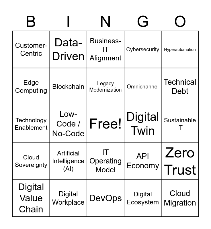 This bingo card has a free space and 50 words: Digital Transformation, Cloud Migration, Agile Delivery, DevOps, Artificial Intelligence (AI), Machine Learning (ML), Data-Driven, Big Data, Edge Computing, Internet of Things (IoT), Blockchain, Cybersecurity, Zero Trust, API Economy, Microservices, Platform Modernization, Legacy Modernization, Digital Twin, Robotic Process Automation (RPA), Hyperautomation, Low-Code / No-Code, Digital Ecosystem, Customer-Centric, Omnichannel, Cloud-Native, Serverless, Technical Debt, Innovation Lab, Business-IT Alignment, IT Operating Model, Software as a Service (SaaS), Platform as a Service (PaaS), Infrastructure as a Service (IaaS), API-First, Digital Workplace, Smart Contracts, Quantum Computing, 5G, Digital Resilience, Sustainable IT, Digital Core, Composable Architecture, Digital Maturity, Data Fabric, Digital Value Chain, Technology Enablement, Digital Trust, AI Ethics, Cloud Sovereignty and Intelligent Automation.