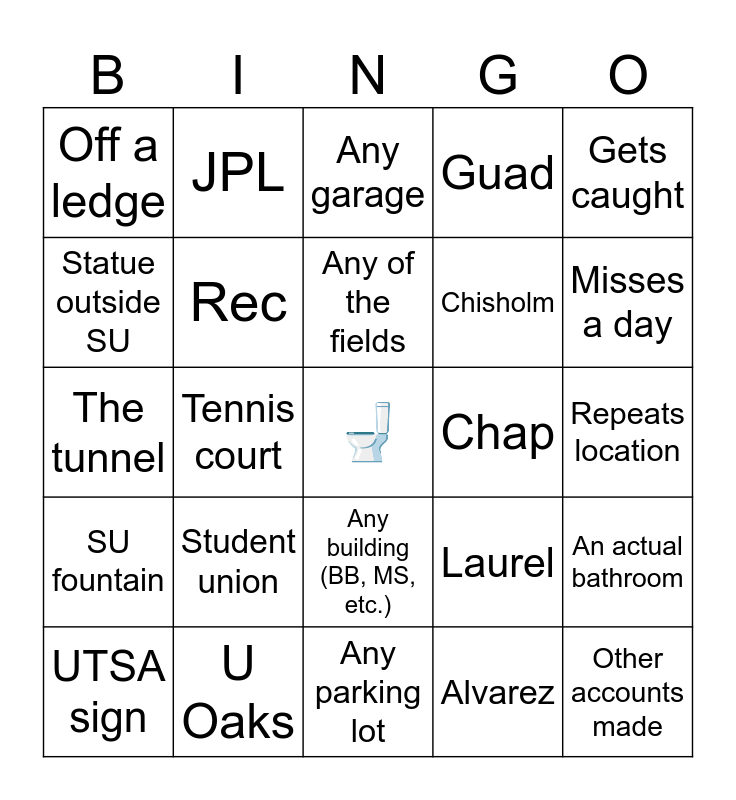 This bingo card has a free space and 24 words: UTSA sign, Student union, Any of the fields, Alvarez, Gets caught, Off a ledge, JPL, Any garage, Chap, Repeats location, The tunnel, Rec, Laurel, An actual bathroom, Statue outside SU, U Oaks, Any parking lot, Guad, Misses a day, SU fountain, Tennis court, Any building (BB, MS, etc.), Chisholm and Other accounts made.