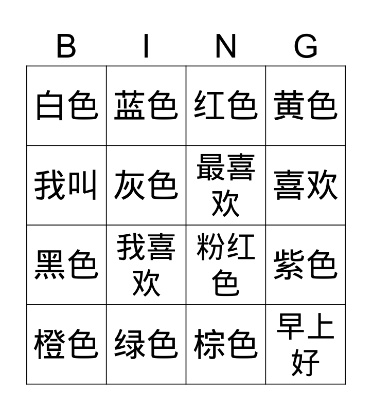 This bingo card has 16 words: 绿色, 紫色, 红色, 白色, 黑色, 蓝色, 粉红色, 棕色, 我叫, 灰色, 橙色, 黄色, 我喜欢, 喜欢, 最喜欢 and 早上好.