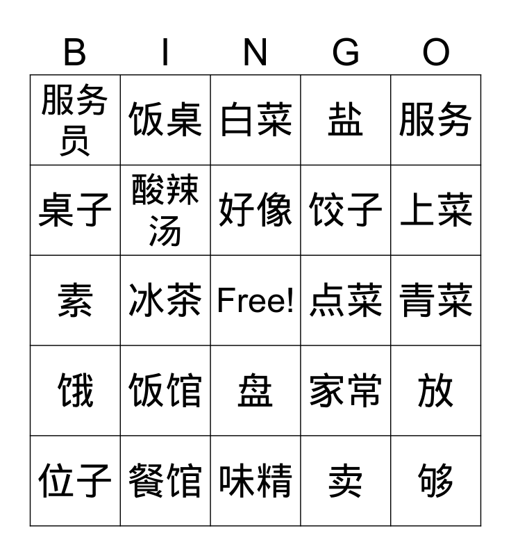 This bingo card has a free space and 24 words: 饭馆, 餐馆, 好像, 位子, 服务, 服务员, 桌子, 饭桌, 点菜, 盘, 饺子, 素, 家常, 放, 酸辣汤, 卖, 青菜, 白菜, 上菜, 冰茶, 够, 饿, 盐 and 味精.