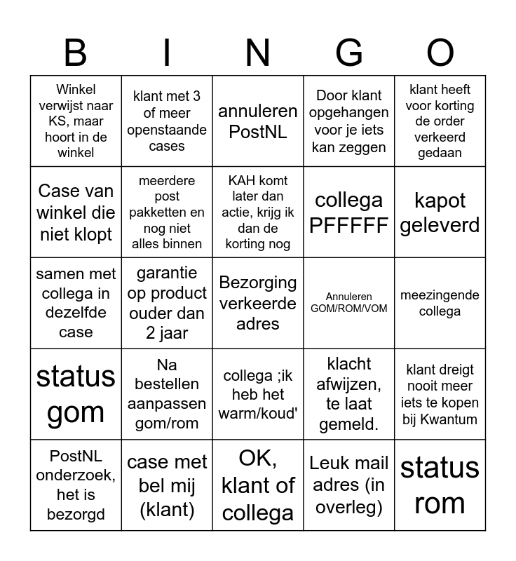 This bingo card has 62 words: Free!, case met bel mij (klant), geen orderbevestiging gehad, winkel aankoop, status gom, status rom, status postNL, meerdere post pakketten en nog niet alles binnen, kan ik nog korting krijg, collega PFFFFF, dubbel dwars (1 bingo vak herhalen), Door klant opgehangen voor je iets kan zeggen, Klant bellen en familie op achtergrond praat mee, Case van winkel die niet klopt, vertraagd op TNB lijst, klant niet ingelicht, reactie van klant: 'bedankt'., Winkel verwijst naar KS, maar hoort in de winkel, Bezorging verkeerde adres, klant heeft voor korting de order verkeerd gedaan, klant wil voor garantie niet terug naar de winkel, KAH komt later dan actie, krijg ik dan de korting nog, Annuleren GOM/ROM/VOM, annuleren PostNL, PostNL onderzoek, het is bezorgd, Leuk mail adres (in overleg), leuke naam (in overleg), klant met zelfde vraag op andere klantenkaart, ik kan niet naar de winkel, ik heb een baby, ik kan niet naar de winkel, een of andere beperking, klant dreigt nooit meer iets te kopen bij Kwantum, klant dreigt met rechter/ bijstand enz., Vraag van klant in andere taal., PostNL voorgemeld na week nog niet verzonden, klant heeft klacht maar stuurt geen foto, klant stuurt foto van product in verpakking, meezingende collega, klant met 3 of meer openstaande cases, klant wil annuleren want is al in de winkel gekocht, NL klant uitleggen dat orderbevestiging factuur is, garantie op product ouder dan 2 jaar, klant zegt: "ik word van het kastje naar de muur gestuurd", samen met collega in dezelfde case, Case in verkeerde WR, Na bestellen aanpassen gom/rom, klant uit Tilburg, kapot geleverd, klacht afwijzen, te laat gemeld., Klant met zelfde voor of achternaam als collega, klant stuurt nogmaals dezelfde foto, Twijfelende of naam Dhr/Mvr is., typfout in mailadres, collega ;ik heb het warm/koud', OK, klant of collega, ik heb meerdere keren bericht gestuurd, er is 1 melding., nieuwe bank garantie proces, Zet maar op de mail om met partner te overleggen, Heel verhaal, klein probleem, case moeten heropenen, klant nogmaals afwijzen, kapotte spiegel, betaling mislukt, kleur komt niet overeen met foto op de site and leuke typfout.