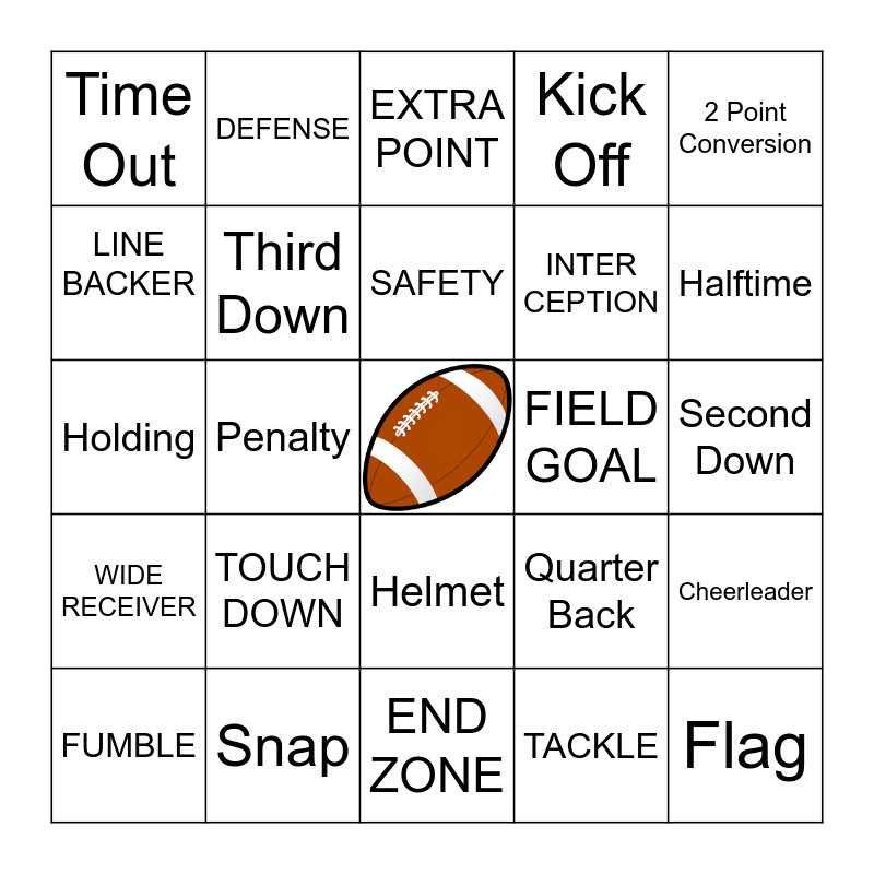 This bingo card has a free space and 39 words: Audible, FIRST DOWN, RUNNING BACK, Third Down, FUMBLE, Helmet, SAFETY, KICKER, 2 Point Conversion, WIDE RECEIVER, Penalty, Kick Off, Flag, Second Down, FIELD GOAL, TOUCH DOWN, Sack, Time Out, Touchback, Quarter Back, LINE BACKER, END ZONE, INTER CEPTION, Halftime, Onside Kick, False start, Go Team, OFF SIDES, Two minute warning, DEFENSE, Safety, OFFENSE, EXTRA POINT, Snap, TACKLE, Game Play, Cheerleader, Holding and Delay of Game.