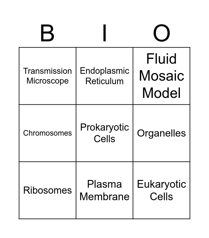 This bingo card has 15 words: Scanning Microscope, High surface to volume ratio, Fluid Mosaic Model, Transmission Microscope, Plasma Membrane, Prokaryotic Cells, Robert Hooke, Phospholipid Bilayer, Organelles, Eukaryotic Cells, Nucleus, Chromosomes, Ribosomes, Endoplasmic Reticulum and Lysosomes.