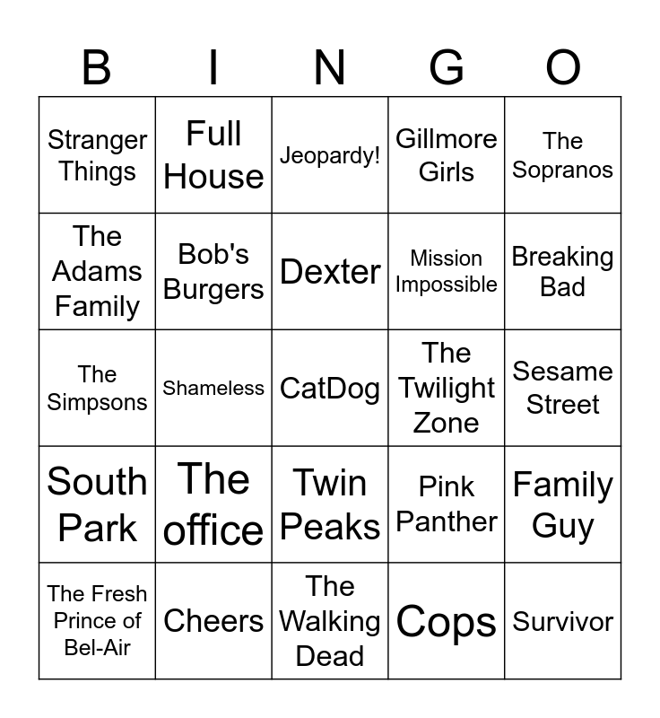 This bingo card has a free space and 31 words: The Walking Dead, The Game of Thrones, Shameless, Grey's Anatomy, Stranger Things, Jeopardy!, Bob's Burgers, Pink Panther, The Twilight Zone, Cops, Sesame Street, Survivor, Law & Order, The X Files, Breaking Bad, Squid Games, Family Guy, The office, South Park, Twin Peaks, The Sopranos, Friends, The Fresh Prince of Bel-Air, Full House, Mission Impossible, The Adams Family, Gillmore Girls, The Simpsons, Cheers, Dexter and That 70's Show.