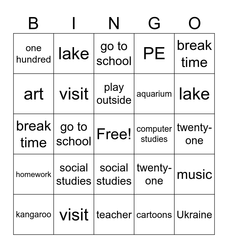 ⚠ This card has duplicate items: maths (2), Ukraine (2), kangaroo (2), teacher (2), social studies (2), homework (2), lake (2), cook (2), art (2), fly a kite (2), visit (2), PE (2), music (2), twenty-one (2), bedroom (2), English (2), play outside (2), computer studies (2), tablet (2), break time (2), go to school (2), cartoons (2), one hundred (2), aquarium (2)