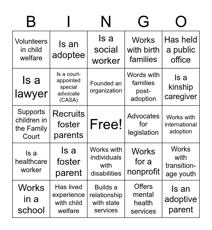 This bingo card has a free space and 24 words: Is a foster parent, Has lived experience with child welfare, Founded an organization, Works in a school, Has held a public office, Volunteers in child welfare, Is a lawyer, Is an adoptee, Advocates for legislation, Works with individuals with disabilities, Words with families post-adoption, Supports children in the Family Court, Works for a nonprofit, Works with transition-age youth, Is a court-appointed special advocate (CASA), Offers mental health services, Works with international adoption, Is a social worker, Is a kinship caregiver, Recruits foster parents, Is an adoptive parent, Is a healthcare worker, Works with birth families and Builds a relationship with state services.