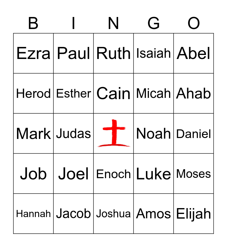 This bingo card has a free space and 29 words: Hannah, Mark, Judas, Cain, Ezra, Ruth, Esther, Joel, Noah, Jacob, Daniel, Elijah, Joshua, Amos, Ahab, Rahab, Enoch, Job, Abel, Mark, Luke, Judas, Micah, Herod, Isaiah, Paul, Moses, Cain and Jacob.
