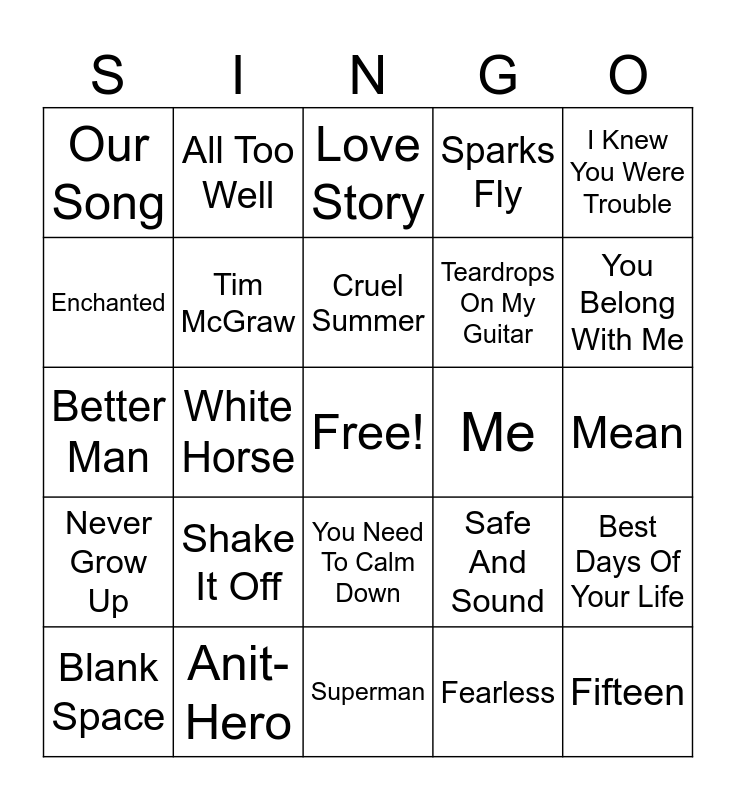 This bingo card has a free space and 24 words: Shake It Off, Anit-Hero, Cruel Summer, Blank Space, I Knew You Were Trouble, Our Song, Enchanted, All Too Well, Me, You Need To Calm Down, Teardrops On My Guitar, Better Man, Safe And Sound, Best Days Of Your Life, Tim McGraw, Fearless, Mean, Love Story, You Belong With Me, White Horse, Fifteen, Never Grow Up, Sparks Fly and Superman.