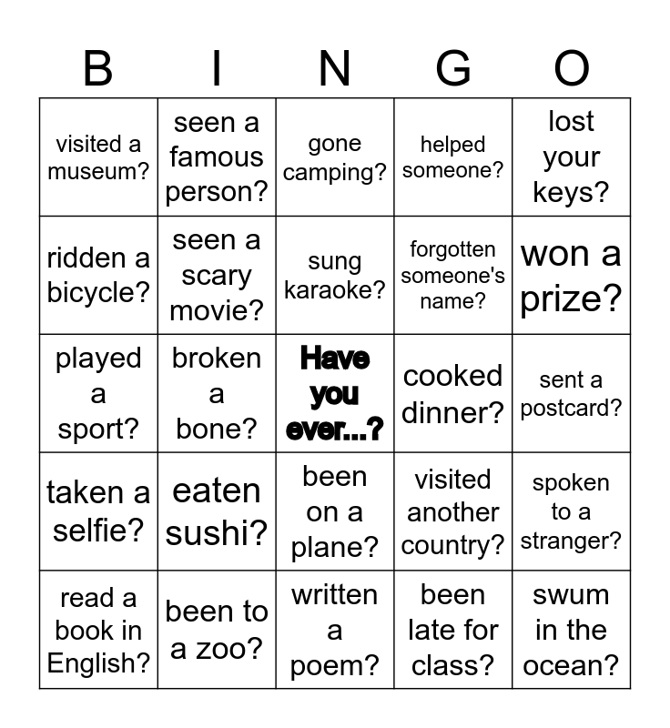 This bingo card has a free space and 24 words: eaten sushi?, been to a zoo?, sung karaoke?, read a book in English?, lost your keys?, visited a museum?, ridden a bicycle?, seen a famous person?, cooked dinner?, been on a plane?, forgotten someone's name?, played a sport?, visited another country?, spoken to a stranger?, seen a scary movie?, been late for class?, sent a postcard?, gone camping?, won a prize?, broken a bone?, swum in the ocean?, taken a selfie?, helped someone? and written a poem?.
