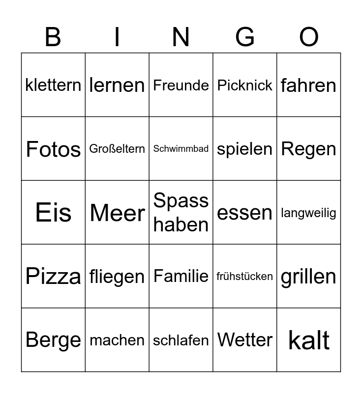 This bingo card has 30 words: machen, Strand, Meer, schwimmen, klettern, Freunde, Großeltern, Familie, essen, schlafen, langweilig, Spass haben, Wetter, kalt, Regen, warm, frühstücken, Pizza, fliegen, fahren, Eis, lesen, lernen, spielen, Fotos, Picknick, grillen, Berge, Schwimmbad and Dorf.