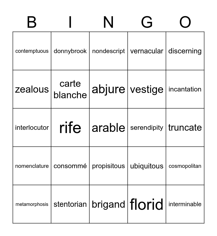 This bingo card has a free space and 24 words: consommé, stentorian, abjure, metamorphosis, discerning, contemptuous, zealous, donnybrook, serendipity, propisitous, vestige, interlocutor, ubiquitous, cosmopolitan, carte blanche, florid, truncate, nondescript, incantation, rife, interminable, nomenclature, vernacular and brigand.