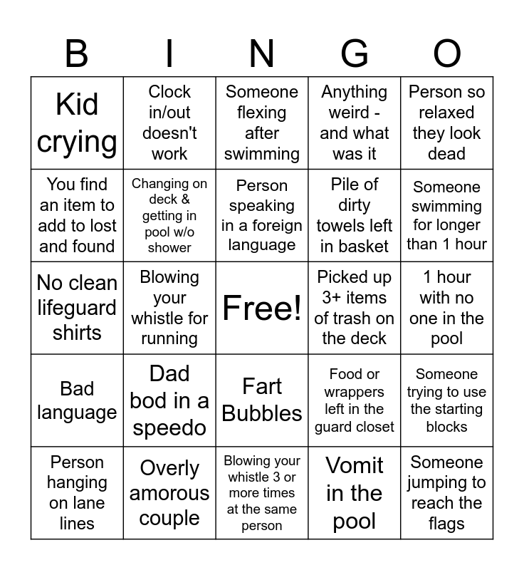 This bingo card has a free space and 24 words: Dad bod in a speedo, Overly amorous couple, Person speaking in a foreign language, Person hanging on lane lines, Person so relaxed they look dead, Kid crying, You find an item to add to lost and found, Clock in/out doesn't work, Picked up 3+ items of trash on the deck, Fart Bubbles, Pile of dirty towels left in basket, No clean lifeguard shirts, Food or wrappers left in the guard closet, Someone trying to use the starting blocks, Changing on deck & getting in pool w/o shower, Vomit in the pool, 1 hour with no one in the pool, Someone flexing after swimming, Someone swimming for longer than 1 hour, Blowing your whistle for running, Someone jumping to reach the flags, Bad language, Anything weird - and what was it and Blowing your whistle 3 or more times at the same person.