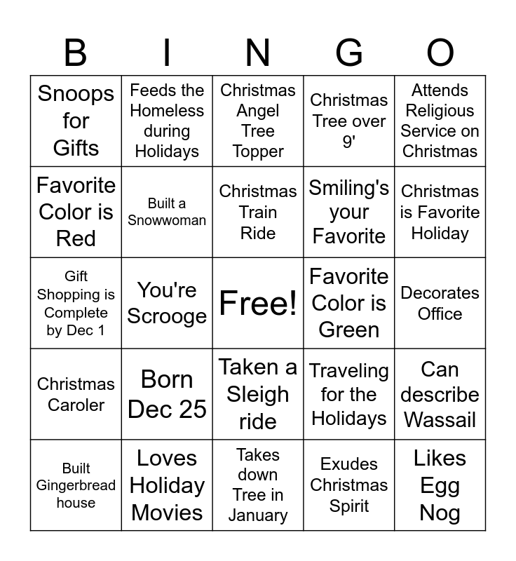 This bingo card has a free space and 24 words: Born Dec 25, Loves Holiday Movies, Christmas Train Ride, Built Gingerbread house, Attends Religious Service on Christmas, Snoops for Gifts, Favorite Color is Red, Feeds the Homeless during Holidays, Favorite Color is Green, Taken a Sleigh ride, Smiling's your Favorite, Gift Shopping is Complete by Dec 1, Traveling for the Holidays, Can describe Wassail, Built a Snowwoman, Exudes Christmas Spirit, Decorates Office, Christmas Angel Tree Topper, Christmas is Favorite Holiday, You're Scrooge, Likes Egg Nog, Christmas Caroler, Christmas Tree over 9' and Takes down Tree in January.