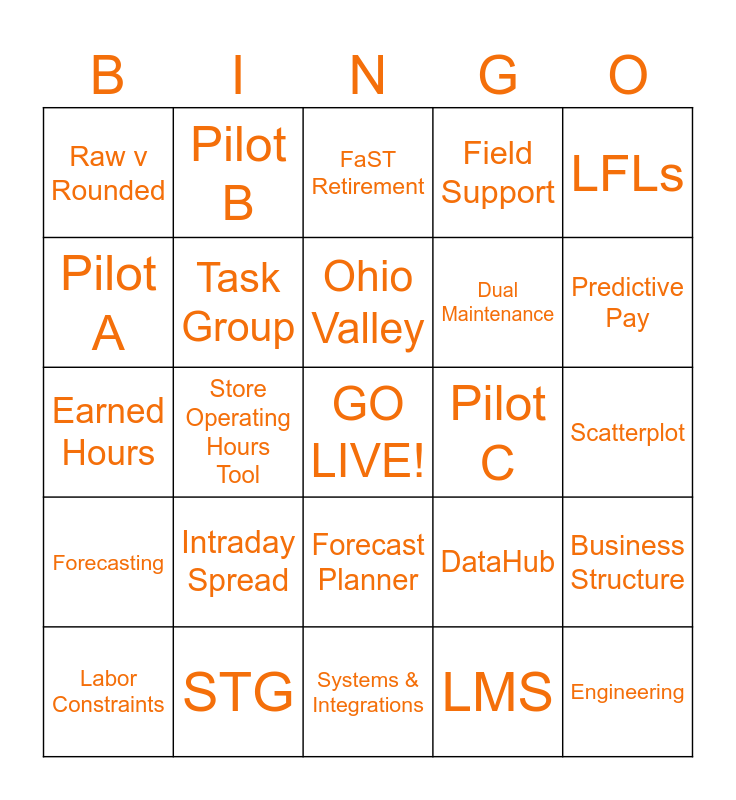 This bingo card has a free space and 24 words: Intraday Spread, STG, Ohio Valley, Labor Constraints, LFLs, Raw v Rounded, Pilot A, Pilot B, Pilot C, Forecast Planner, Dual Maintenance, Earned Hours, DataHub, Business Structure, Task Group, LMS, Scatterplot, FaST Retirement, Predictive Pay, Store Operating Hours Tool, Engineering, Forecasting, Field Support and Systems & Integrations.