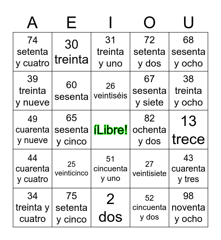 This bingo card has a free space and 101 words: 0 cero, 1 uno, 2 dos, 3 tres, 4 cuatro, 5 cinco, 6 seis, 7 siete, 8 ocho, 9 nueve, 10 diez, 11 once, 12 doce, 13 trece, 14 catorce, 15 quince, 16 dieciséis, 17 diecisiete, 18 dieciocho, 19 diecinueve, 20 veinte, 21 veintiuno, 22 veintidós, 23 veintitrés, 24 veinticuatro, 25 veinticinco, 26 veintiséis, 27 veintisiete, 28 veintiocho, 29 veintinueve, 30 treinta, 31 treinta y uno, 32 treinta y dos, 33 treinta y tres, 34 treinta y cuatro, 35 treinta y cinco, 36 treinta y seis, 37 treinta y siete, 38 treinta y ocho, 39 treinta y nueve, 40 cuarenta, 41 cuarenta y uno, 42 cuarenta y dos, 43 cuarenta y tres, 44 cuarenta y cuatro, 45 cuarenta y cinco, 46 cuarenta y seis, 47 cuarenta y siete, 48 cuarenta y ocho, 49 cuarenta y nueve, 50 cincuenta, 51 cincuenta y uno, 52 cincuenta y dos, 53 cincuenta y tres, 54 cincuenta y cuatro, 55 cincuenta y cinco, 56 cincuenta y seis, 57 cincuenta y siete, 58 cincuenta y ocho, 59 cincuenta y nueve, 60 sesenta, 61 sesenta y uno, 62 sesenta y dos, 63 sesenta y tres, 64 sesenta y cuatro, 65 sesenta y cinco, 66 sesenta y seis, 67 sesenta y siete, 68 sesenta y ocho, 69 sesenta y nueve, 70 setenta, 71 setenta y uno, 72 setenta y dos, 73 setenta y tres, 74 setenta y cuatro, 75 setenta y cinco, 76 setenta y seis, 77 setenta y siete, 78 setenta y ocho, 79 setenta y nueve, 80 ochenta, 81 ochenta y uno, 82 ochenta y dos, 83 ochenta y tres, 84 ochenta y cuatro, 85 ochenta y cinco, 86 ochenta y seis, 87 ochenta y siete, 88 ochenta y ocho, 89 ochenta y nueve, 90 noventa, 91 noventa y uno, 92 noventa y dos, 93 noventa y tres, 94 noventa y cuatro, 95 noventa y cinco, 96 noventa y seis, 97 noventa y siete, 98 noventa y ocho, 99 noventa y nueve and 100 cien.