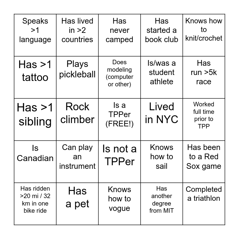 This bingo card has a free space and 26 words: Is not a TPPer, Has another degree from MIT, Does modeling (computer or other), Has a pet, Knows how to knit/crochet, Speaks >1 language, Has >1 tattoo, Has lived in >2 countries, Worked full time prior to TPP, Knows how to sail, Is/was a student athlete, Has >1 sibling, Has been to a Red Sox game, Has ridden >20 mi / 32 km in one bike ride, Rock climber, Plays badminton, Has started a book club, Is Canadian, Has never camped, Completed a triathlon, Has run >5k race, Knows how to vogue, Lived in NYC, Can play an instrument, Plays pickleball and Is excited to grill this weekend.