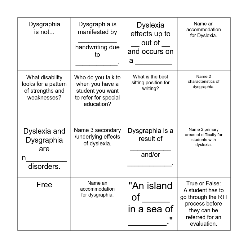 This bingo card has 20 words: Free, Dyslexia is not..., Dyslexia effects up to __ out of __ and occurs on a _________, Name 2 primary areas of difficulty for students with dyslexia., Dyslexia comes from a deficit in the ph________ c_________ of language., Name 3 secondary /underlying effects of dyslexia., "An island of _____ in a sea of _______.", Name an accommodation for Dyslexia., Dyslexia and Dysgraphia are n__________ disorders., Dysgraphia is manifested by ___________ handwriting due to ____________., Dysgraphia is a result of ___________ and/or ____________., Name 2 characteristics of dysgraphia., Dysgraphia is not..., Name an accommodation for dysgraphia., What is the best sitting position for writing?, H_________ stimulates more of the brain than t_______., What disability looks for a pattern of strengths and weaknesses?, Who do you talk to when you have a student you want to refer for special education?, Where does 90% of referral information come from? and True or False: A student has to go through the RTI process before they can be referred for an evaluation..