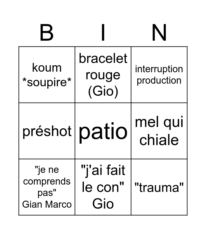This bingo card has a free space and 8 words: mel qui chiale, interruption production, bracelet rouge (Gio), "je ne comprends pas" Gian Marco, koum *soupire*, "trauma", préshot and "j'ai fait le con" Gio.
