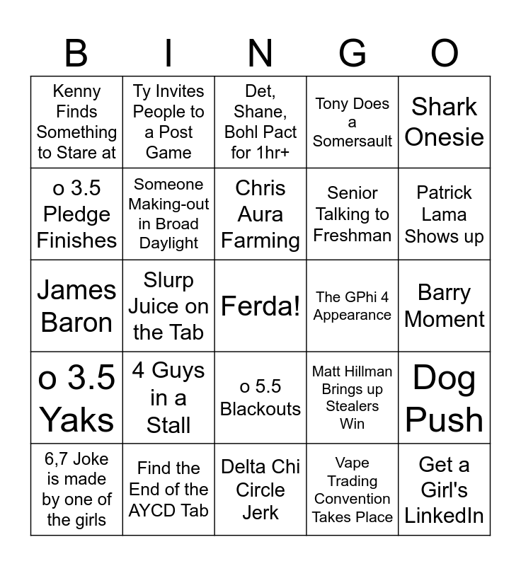 This bingo card has a free space and 24 words: 4 Guys in a Stall, Find the End of the AYCD Tab, Chris Aura Farming, 6,7 Joke is made by one of the girls, Shark Onesie, Kenny Finds Something to Stare at, o 3.5 Pledge Finishes, Ty Invites People to a Post Game, The GPhi 4 Appearance, o 5.5 Blackouts, Senior Talking to Freshman, James Baron, Matt Hillman Brings up Stealers Win, Dog Push, Someone Making-out in Broad Daylight, Vape Trading Convention Takes Place, Barry Moment, Det, Shane, Bohl Pact for 1hr+, Patrick Lama Shows up, Slurp Juice on the Tab, Get a Girl's LinkedIn, o 3.5 Yaks, Tony Does a Somersault and Delta Chi Circle Jerk.