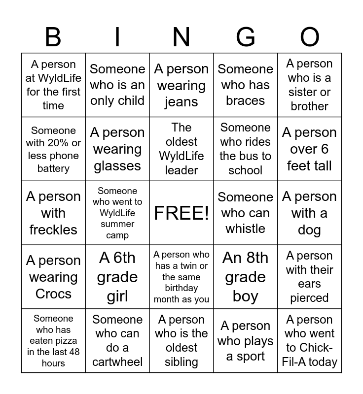 This bingo card has a free space and 24 words: A 6th grade girl, Someone who can do a cartwheel, The oldest WyldLife leader, Someone who has eaten pizza in the last 48 hours, A person who is a sister or brother, A person at WyldLife for the first time, Someone with 20% or less phone battery, Someone who is an only child, Someone who can whistle, A person who has a twin or the same birthday month as you, Someone who rides the bus to school, A person with freckles, An 8th grade boy, A person with their ears pierced, A person wearing glasses, A person who plays a sport, A person with a dog, A person wearing jeans, A person over 6 feet tall, Someone who went to WyldLife summer camp, A person who went to Chick-Fil-A today, A person wearing Crocs, Someone who has braces and A person who is the oldest sibling.