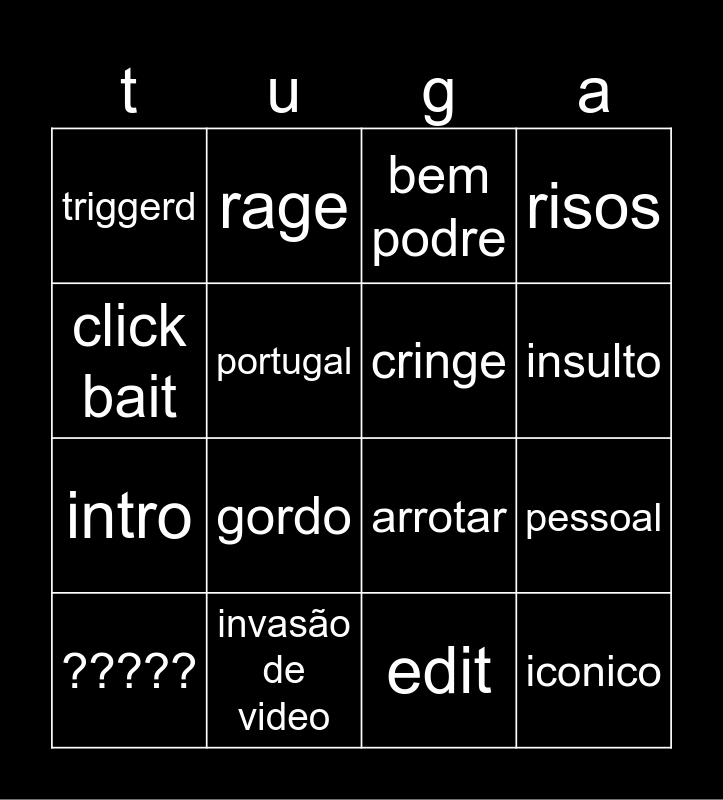 This bingo card has 20 words: pessoal, piada má, bem podre, palavrões, ?????, click bait, invasão de video, triggerd, intro, rage, gordo, arrotar, portugal, iconico, cringe, random, insulto, risos, edit and musiquinha.