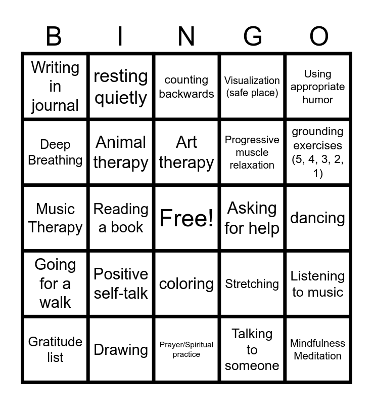 This bingo card has a free space and 24 words: Positive self-talk, Drawing, Art therapy, Gratitude list, Using appropriate humor, Writing in journal, Deep Breathing, resting quietly, Asking for help, coloring, Progressive muscle relaxation, Music Therapy, Stretching, Listening to music, Animal therapy, Talking to someone, dancing, counting backwards, grounding exercises (5, 4, 3, 2, 1), Reading a book, Mindfulness Meditation, Going for a walk, Visualization (safe place) and Prayer/Spiritual practice.