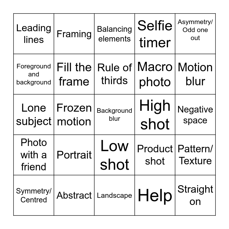 This bingo card has 25 words: Portrait, Landscape, Rule of thirds, Symmetry/ Centred, Asymmetry/ Odd one out, Leading lines, Foreground and background, Framing, High shot, Low shot, Macro photo, Lone subject, Product shot, Pattern/ Texture, Fill the frame, Straight on, Negative space, Balancing elements, Motion blur, Frozen motion, Background blur, Abstract, Photo with a friend, Selfie timer and Help.