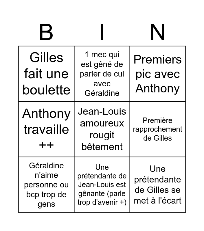 This bingo card has a free space and 8 words: Première rapprochement de Gilles, Premiers pic avec Anthony, 1 mec qui est gêné de parler de cul avec Géraldine, Géraldine n'aime personne ou bcp trop de gens, Gilles fait une boulette, Une prétendante de Gilles se met à l'écart, Anthony travaille ++ and Une prétendante de Jean-Louis est gênante (parle trop d'avenir +).