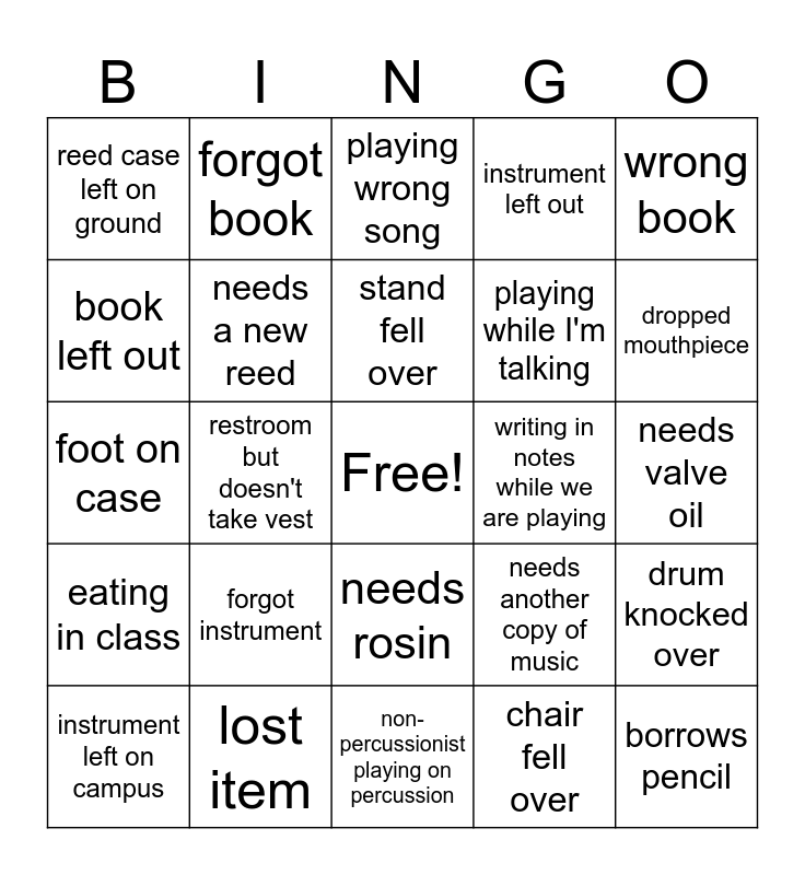 This bingo card has a free space and 24 words: forgot instrument, lost item, stand fell over, instrument left on campus, wrong book, reed case left on ground, book left out, forgot book, writing in notes while we are playing, needs rosin, playing while I'm talking, foot on case, needs another copy of music, drum knocked over, needs a new reed, chair fell over, needs valve oil, playing wrong song, dropped mouthpiece, restroom but doesn't take vest, borrows pencil, eating in class, instrument left out and non-percussionist playing on percussion.