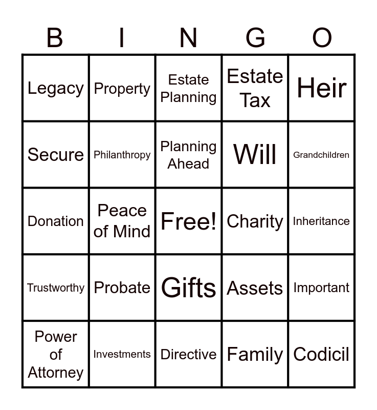 This bingo card has a free space and 29 words: Power of Attorney, Beneficiary, Peace of Mind, Executor, Legacy, Estate Planning, Philanthropy, Probate, Charity, Investments, Inheritance, Codicil, Directive, Family, Grandchildren, Insurance, Gifts, Trustworthy, Heir, Donation, Assets, Trust, Will, Secure, Estate Tax, Property, Important, Planning Ahead and Future.