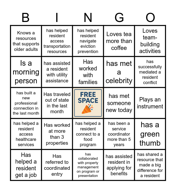 This bingo card has a free space and 24 words: Has worked at more than 3 properties, Has referred to coordinated entry, Has worked with families, Has helped a resident get a job, Loves team-building activities, Knows a resources that supports older adults, Is a morning person, has helped resident access transportation resources, has met someone new today, has helped a resident connect to a food program, has met a celebrity, has built a new professional connection in the last month, has been a service coordinator more than 5 years, has a green thumb, has assisted a resident with utility assistance, has assisted resident in applying for benefits, Plays an instrument, has helped resident navigate eviction prevention, has successfully mediated a resident conflict, Has traveled out of state in the last month, has shared a resource that made a big difference for a resident, has helped a resident access healthcare services, Loves tea more than coffee and has collaborated with property management on program or presentation.